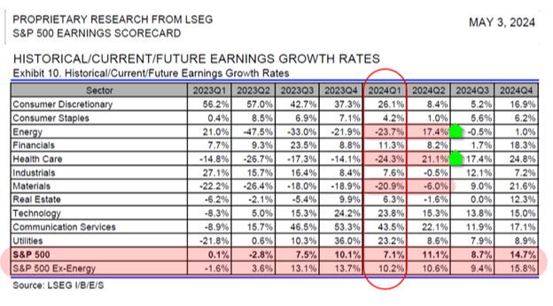 Furthermore, S&P 500 earnings grew 7.1% on a quarterly basis thus far, and 10.2% when excluding energy companies: