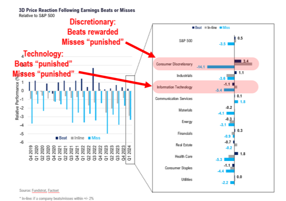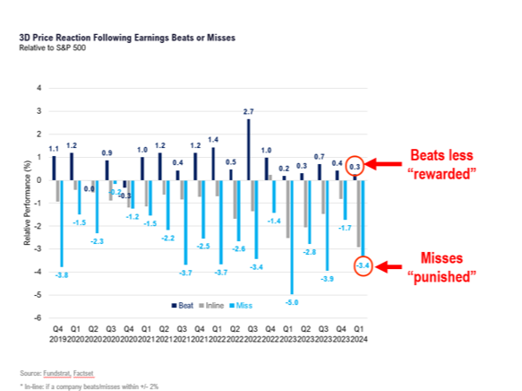 Another takeaway is that despite strong EPS beats, stock reactions have been muted relative to the last three quarters. One-day gains after beats are averaging 0.5% versus 1% for the prior three quarters. Inline results are flat, which is consistent with history. Meanwhile, EPS misses are producing average one-day losses of 3.5% versus 2% in prior quarters.
