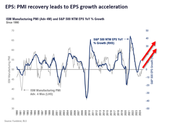 Third, this EPS growth improvement is historically consistent with early cycle earnings growth, which follows an upturn in purchasing managers index (PMI) readings (measures of manufacturing activity):