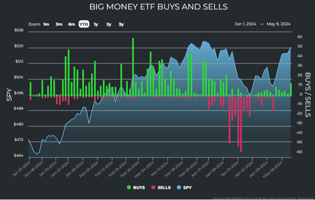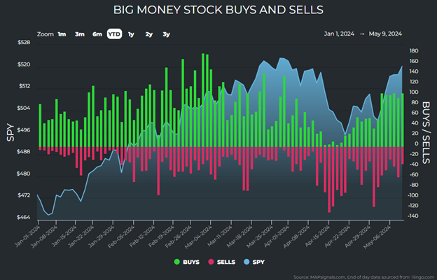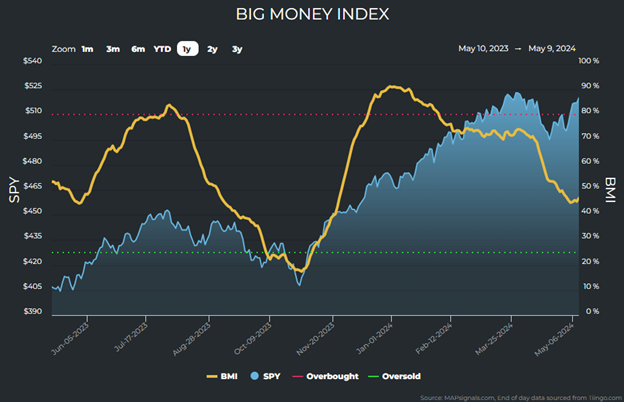 As our readers might recall, the trusty Big Money Index (BMI) from our friends at MAPsignals had a precipitous 40% drop throughout April. The BMI is a 25-day moving average of netted buys and sells by “big money” professional investors.