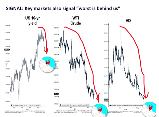 Lastly, with the economy no longer seeming “red hot” due to cooler employment reports, the market is assigning more credibility to the Fed’s dovish view. This is evidenced by the continued decline in interest rates, crude oil prices, and market volatility: