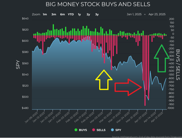 Most interestingly, when overlaying this volatility with institutional buying and selling, we see the increases in selling that correspond with the increased volumes. Whereas since volumes and volatility settled, there has been almost no significant selling of any kind, allowing equities to begin stabilizing after capitulation: