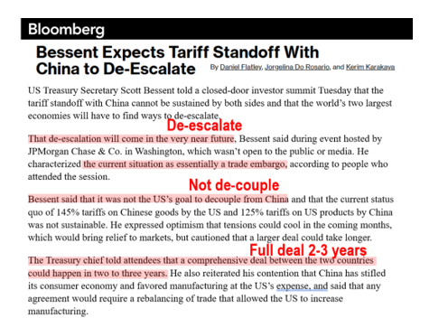 Our increased attention to Secretary Bessent’s comments stemmed from earlier reports indicating a closed-door discussion between Bessent and JP Morgan's clients. Bloomberg reported that he refocused the situation with China, saying it’s likely to de-escalate from its current state: