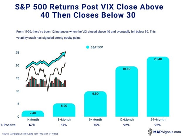 Our friends at MAPsignals did the work. Since 1990, there have been about a dozen instances where the VIX ascended to 40 only to subsequently drop below 30. Stocks rose from one month to two years later: