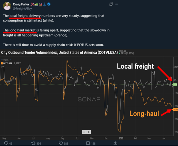 This data suggests a deep weakness in supply chains, which could lead to the possibility of local retail issues within a few months. This is the type of data that could lead the administration to accelerate its efforts to get deals done before the expiration of the 90-day reciprocal tariff moratorium.