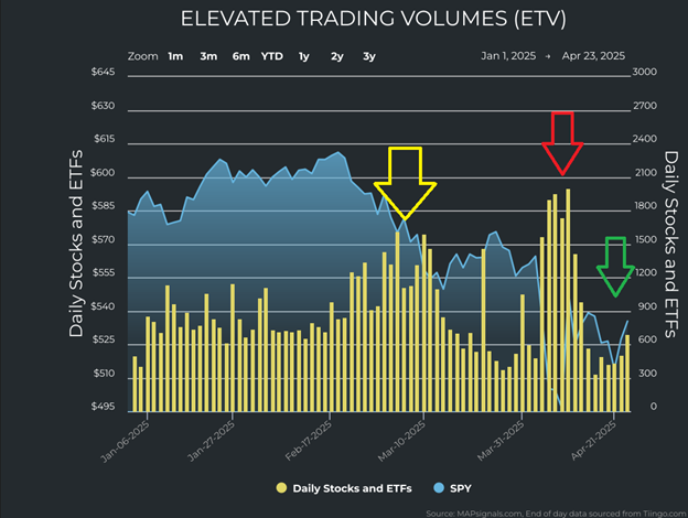 In the trade volumes chart below you can see the initial increase in volume in late February and early March (yellow arrow) overlaid against the S&P 500. The index dropped, followed by a lull, and then fell further on tariff announcements (red arrow). This created extreme capitulation, forcing stocks to crash. There’s since been a bounce back, with elevated volumes and volatility, as indicated by the green arrow.