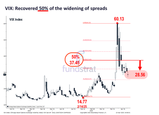 The CBOE Volatility Index (VIX)^, which is often dubbed the market’s “fear gauge,” almost recovered more than 50% of the widening spreads last week, dropping down to 28.56 as of this writing: