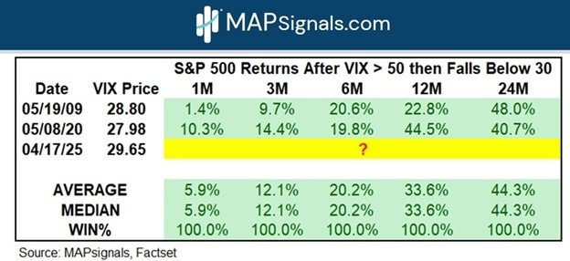Drilling further, going back to 1990, there are only two previous instances of the VIX rising to 50, then dropping to 30. Forward performance is even more bullish: