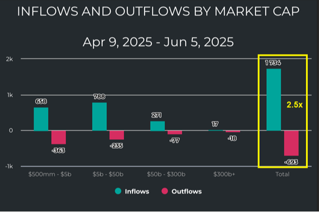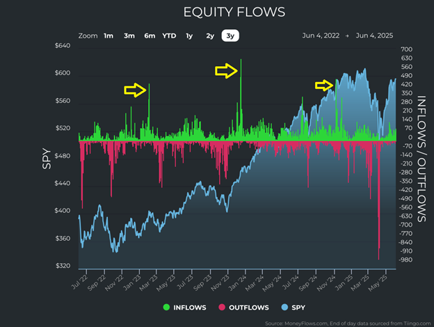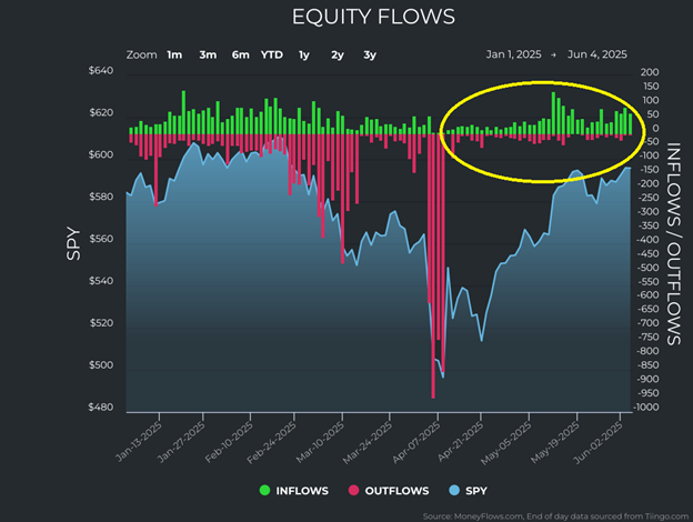 Another reason we think this is a hated, unnoticed rally is the underlying money flows into equities since April 9. As most of the financial media wasn't looking, equity inflows have vastly exceeded outflows:
