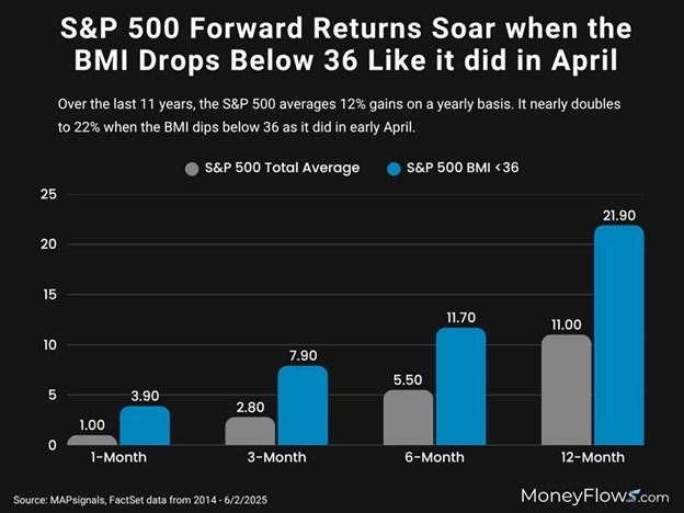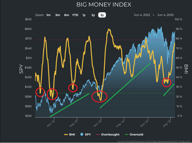 As a quick refresher, we discussed positive forward return expectations after MoneyFlows’ trusty Big Money Index, a 25-day moving average of “big money” investor activity, dropped below 36% in April.