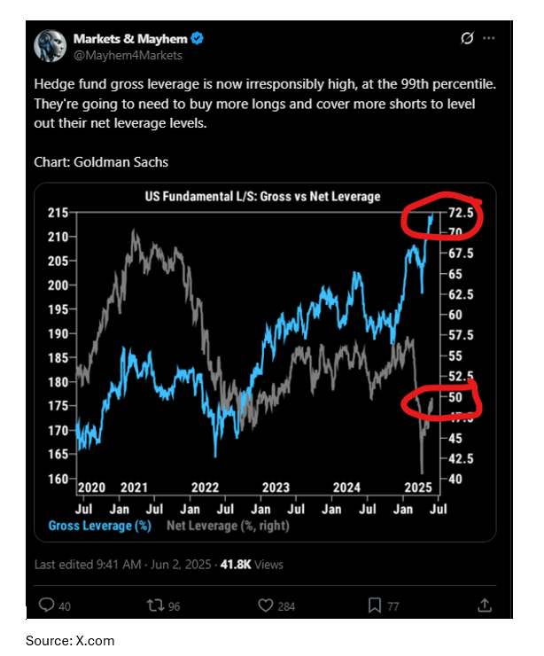 However, remember that hedge fund short leverage is at historical highs. There's a high probability that short covering will come into play in short order. If so, it could ignite an extreme, face-ripping cherry on top of the current run.