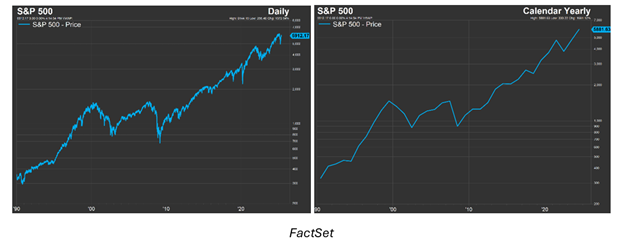 This is the power of tuning out and zooming out. To further prove the point, below are market returns for the past 35 years. The chart on the left is the daily action, the one on the right is yearly performance: