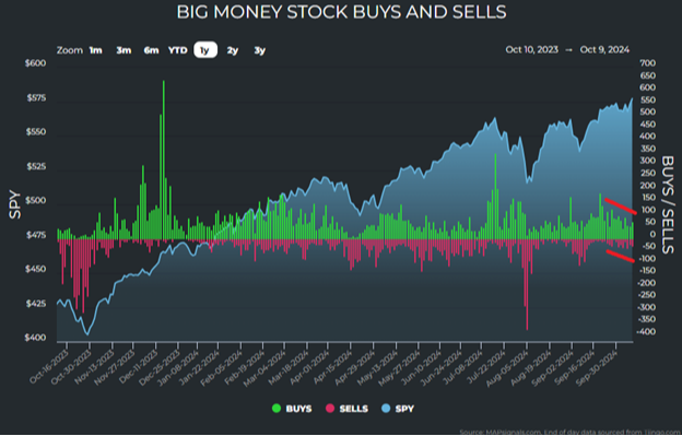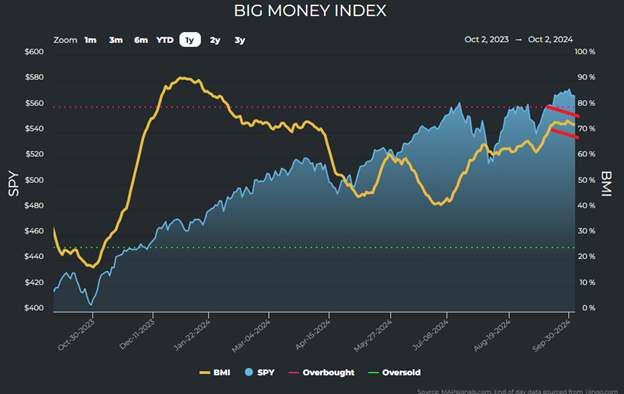 Understanding the onion’s layers, it’s helpful to show this is also consistent with the setup of MAPsignals’ trusty Big Money Index (BMI), a 25-day moving average of “big money” investor buys and sells.