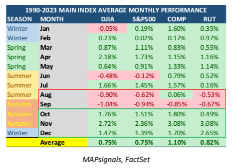 Going one layer deep, October starts a seasonally strong time of the year. Average returns for Octobers through 2023 are solidly positive: