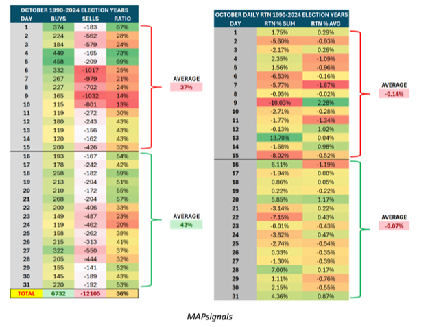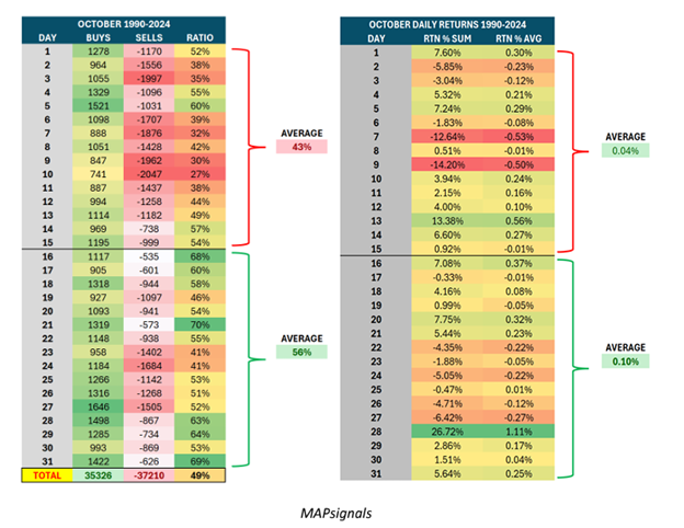 Sellers run the show from Oct. 1-15, with an average buying ratio of 43% (so 57% of the action is selling). But from Oct. 16-31, buyers rule, generating 56% of all signals. The daily average returns (right table) reflect this too.
