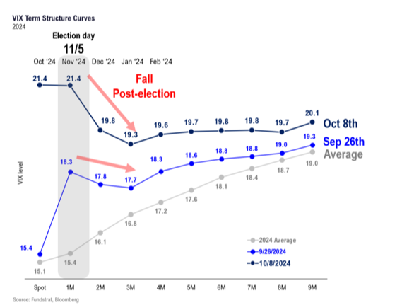 This measures the spread between four months out and one month out. This inversion is now steeper than the recent past, indicating markets see near-term volatility peaking around Election Day.