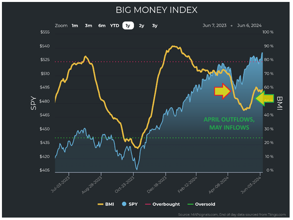 We’ll start with MAPsignals’ trusty Big Money Index (BMI), which is a 25-day moving average of “big money” professional investor netted buys and sells. April saw money flowing out of stocks, May showed a strong reversion, while early June saw a pause yet still had notable inflows: