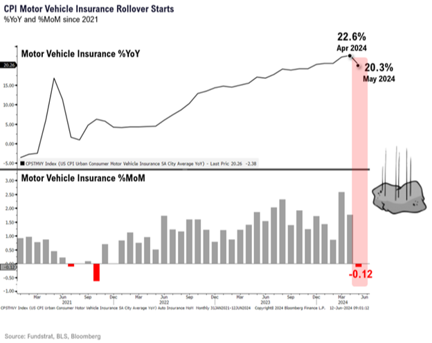 As our readers know, we’ve previously said CPI was being held up by housing and auto insurance costs. Now one of them is breaking:
