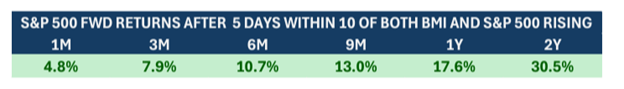 Since 1990, this setup has happened on 577 out of 8,648 possible trading days, or only 6.7% of all instances. It is rare and bullish – forward returns are excellent: