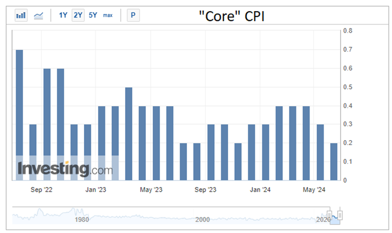 May’s “core CPI” reading, which excludes energy and food costs, was a huge downside figure that came in at 0.16% month-over-month versus an expected consensus of 0.28%. This is a meaningful improvement from the 0.36% and 0.39% monthly readings from the start of the year that increasingly appear to be the outliers.