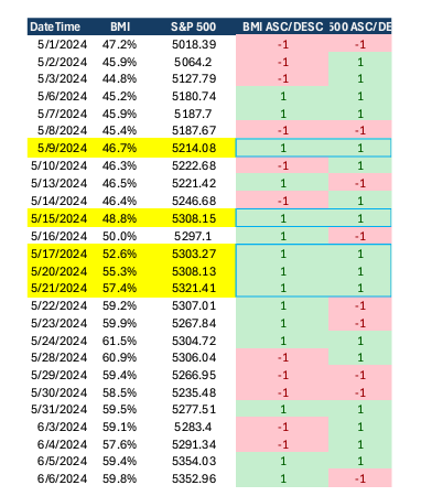 And there's one last bit of good news. Both the S&P 500 and BMI rose in five out of 10 trading days from May 9-21: