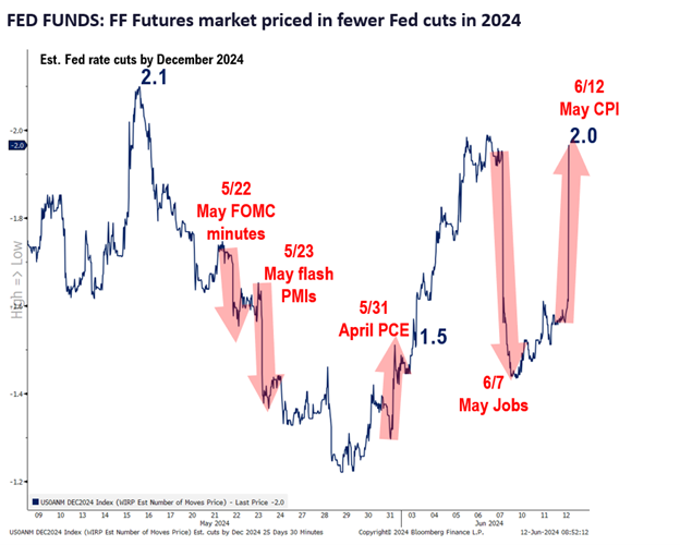 Furthermore, immediately following the CPI report, the federal funds rate futures rate cut expectation jumped from 1.5 cuts earlier in the week to 2: