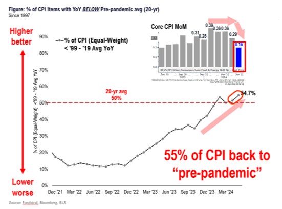 Putting a bow on this, perhaps the most important factor is there’s enough data to show the composition of the CPI is much healthier overall. For instance, the percentage of CPI components with inflation below pre-pandemic averages is now 55%, which is above the 50% average since 1980: