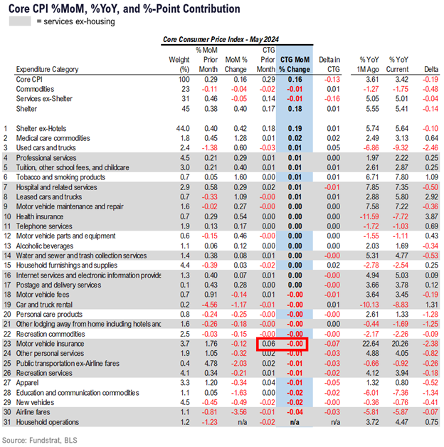 The biggest downward driver was auto insurance. Last month, auto insurance added 0.06% to Core CPI, while this month it was 0%. This is a huge difference and a major positive sign the auto insurance surge is peaking.